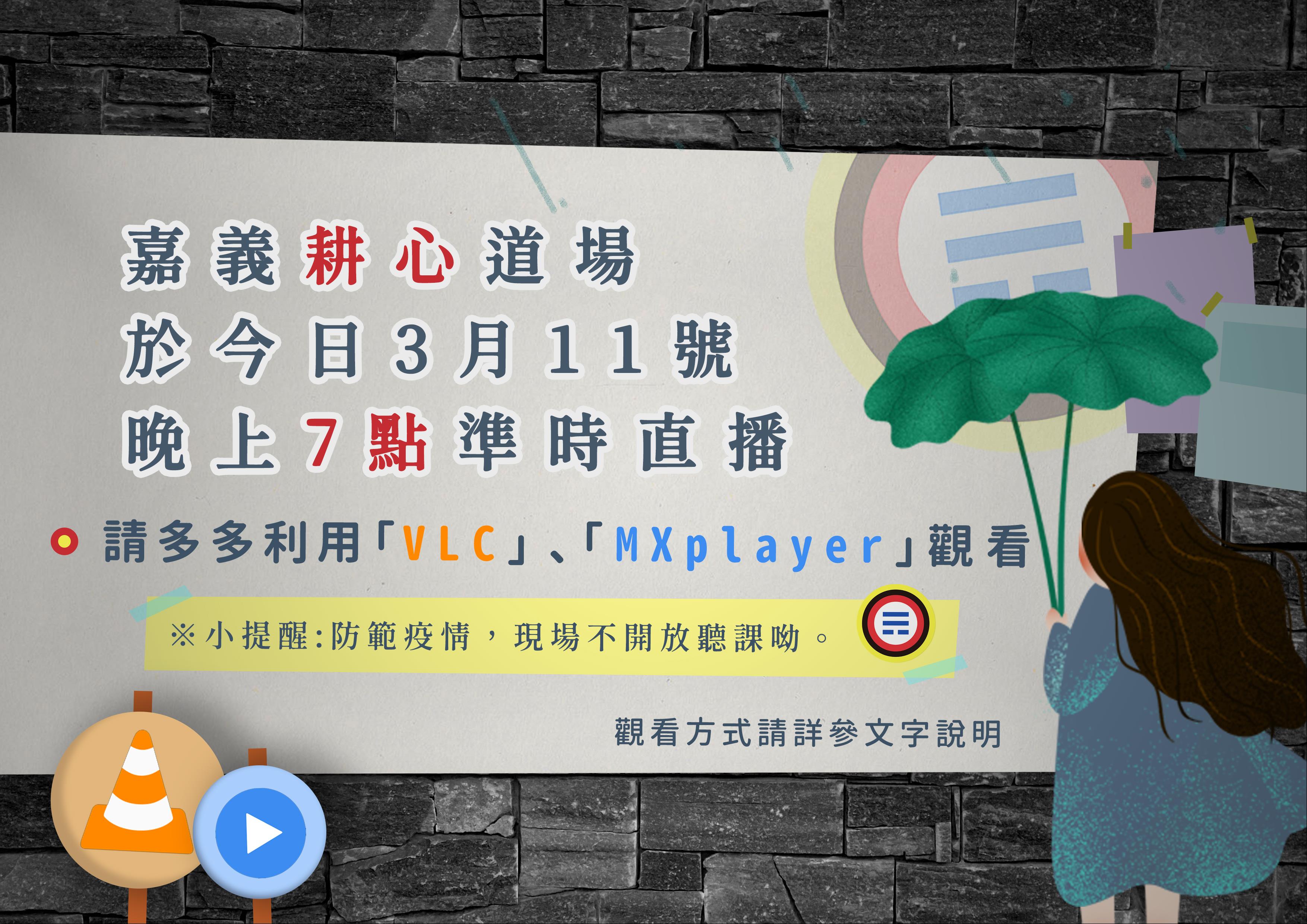嘉義耕心道場由陳丁茂主講,於本日晚間7點準時直播授課。請大家多多利用「VLC」或「MXplayer」觀看。