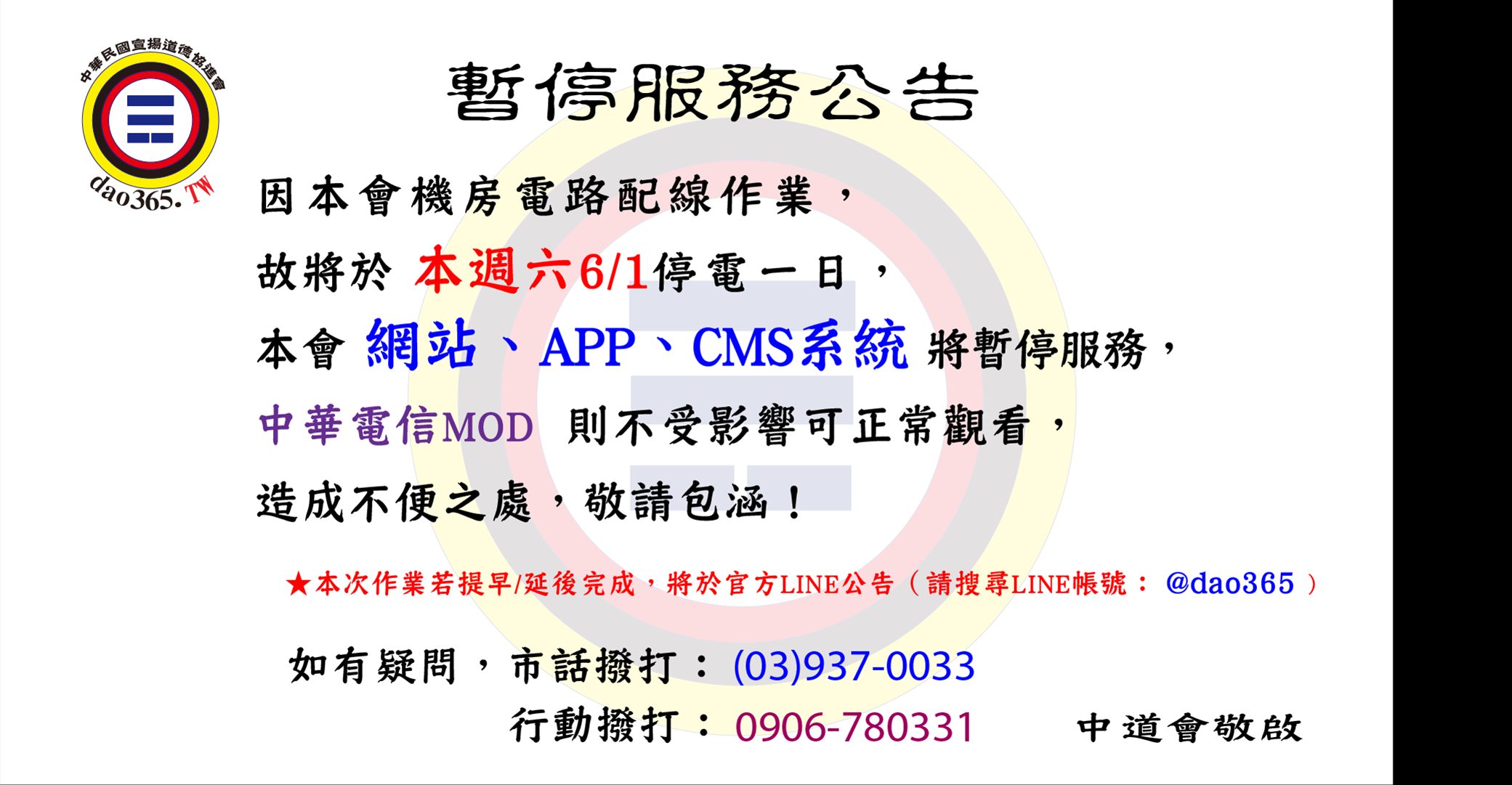 【暫停服務】為配合台機房電路配線作業,本會於6月1日暫停CMS系統、網站及APP服務